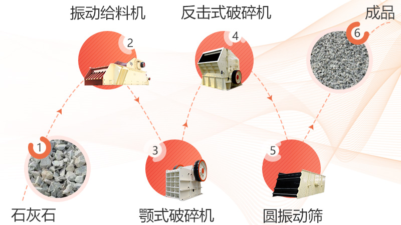 物料由GZD-1500×5600振動(dòng)給料機(jī)均勻、定量、連續(xù)地輸送進(jìn)PE-1200×1500鄂式破碎機(jī),進(jìn)行粗碎,粗碎后的石料由輸送機(jī)送到PF-1520反擊式破碎機(jī)進(jìn)行細(xì)碎;破碎后的物料由輸送機(jī)送進(jìn)振動(dòng)篩進(jìn)行篩分,符合粒度要求的石料由成品輸送機(jī)送往成品料堆;不符合粒度要求的物料由輸送機(jī)返料送到PF-1520反擊式破碎機(jī)再次破碎,形成閉路多次循環(huán)。生產(chǎn)過程中,各級(jí)設(shè)備配備合理,提高了生產(chǎn)效率。
